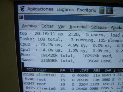 TOP del servidor con los 3 clientes conectados… 75%cpu abriendo OpenOffice en los 3 clientes.