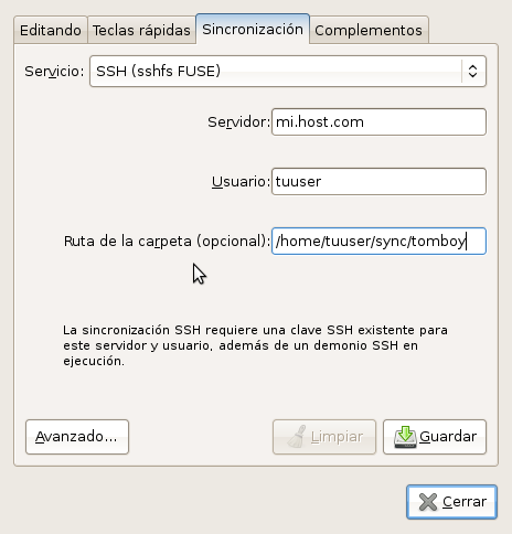 ¿Ahora donde viene el problema? El problema viene al momento de configurar Tomboy para usar la sincronización con SSH (FUSE), les dejo un pantallazo para que vean donde es.
